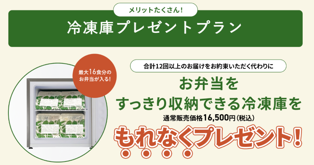 冷凍庫プレゼントプランとは、通常の14食コースか21食コースを月1回以上、合計12回の注文をすることで16,500円の専用冷凍庫を無料でもらうことのできるプランです。