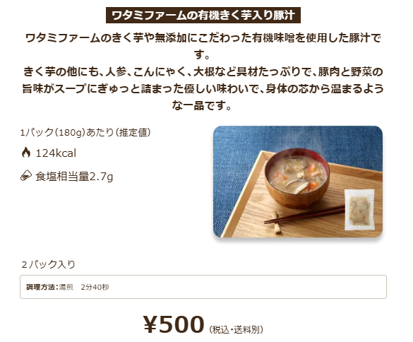 スープのカテゴリーでおすすめなのは「ワタミファームの有機きく芋入り豚汁」です。